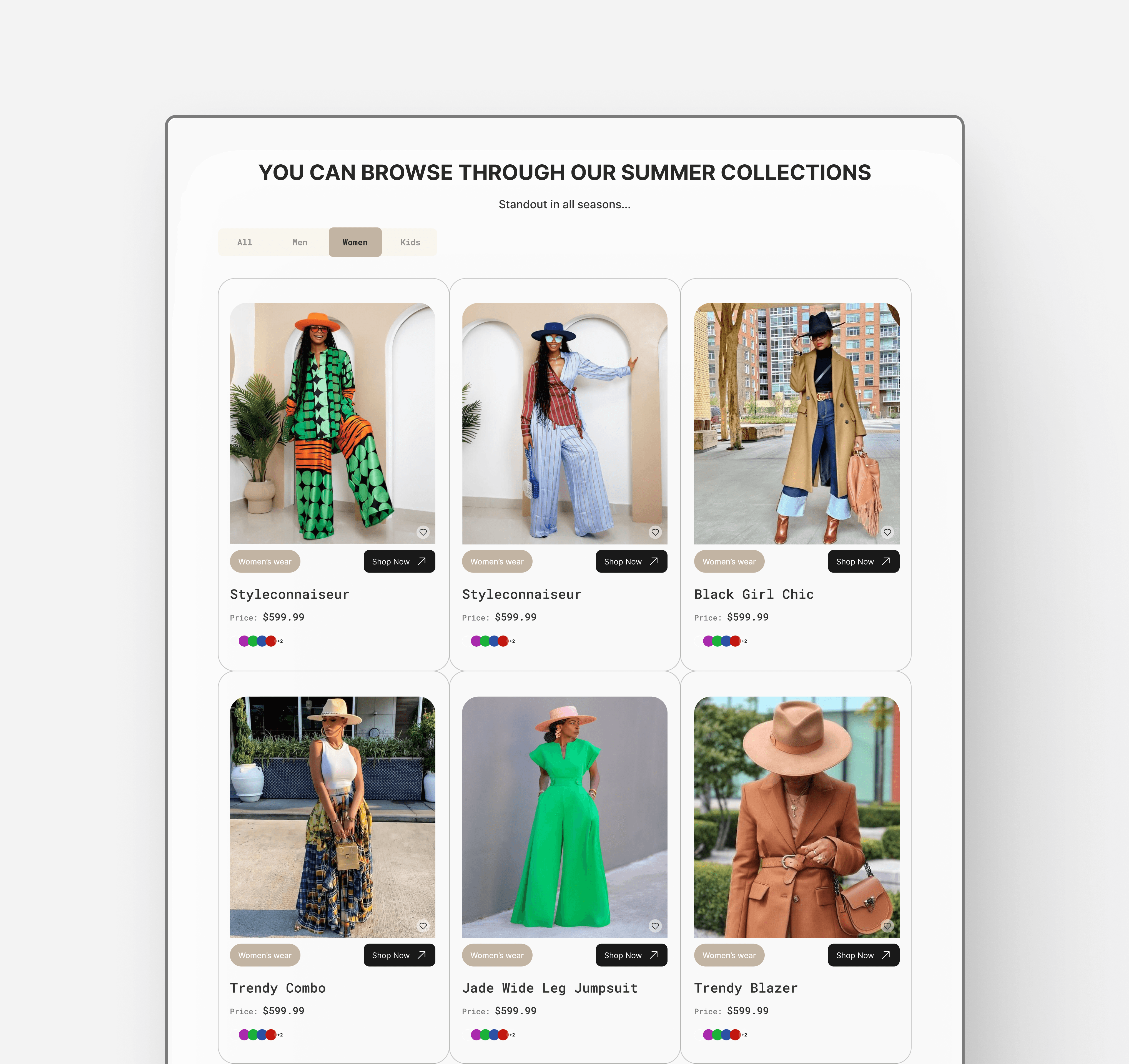 A modern e-commerce interface designed to showcase women’s fashion collections in a visually engaging and easy-to-browse layout. The design focuses on clear product discovery, stylish presentation, and intuitive shopping actions that help users quickly discover styles that match their preferences while maintaining a premium fashion aesthetic.
